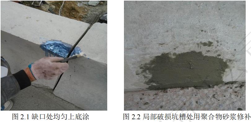 第二道工序:將局部破損較嚴重區域采用聚合物砂漿修補平整。