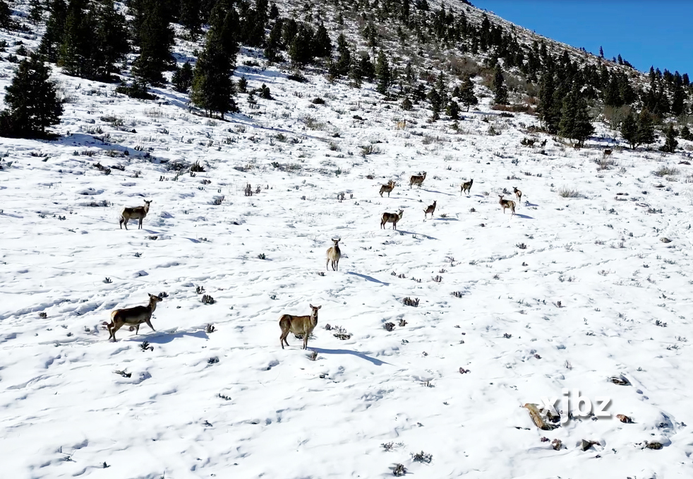 近日,一群野生天山馬鹿在巴音布魯克草原覓食。(申凱龍 攝)