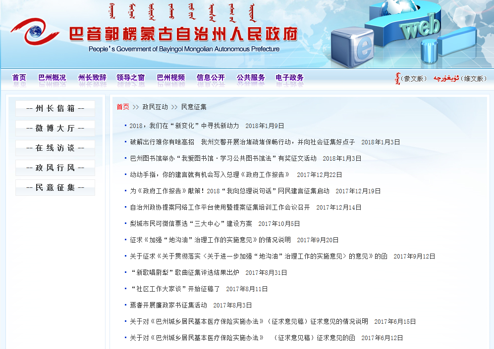 圖為 巴州人民政府網站民意征集欄目