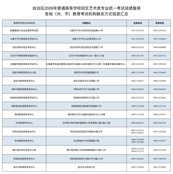 成績復核程序:成績復核工作由新疆教育考試院統籌實施。各地(州、市)教育考試機構具體負責屬地考生成績復核工作(按照復核流程相關要求,新疆教育考試院不直接接受考生個人復核申請)。申請成績復核的考生自行下載并填寫《自治區2026年普通高等學校招生藝術類專業統一考試成績復核申請表》(附件1),于1月27日至29日向生源所在地(州、市)教育考試機構提出成績復核書面申請,逾期不再受理。復核結果由各地(州、市)教育考試機構向考生反饋。