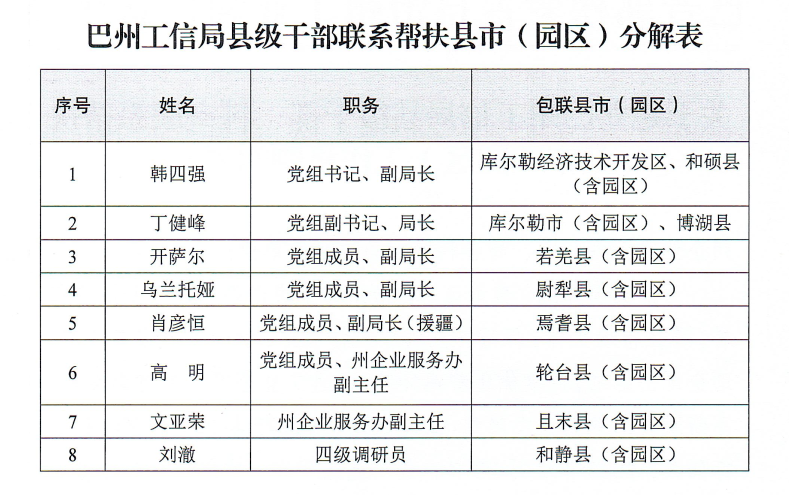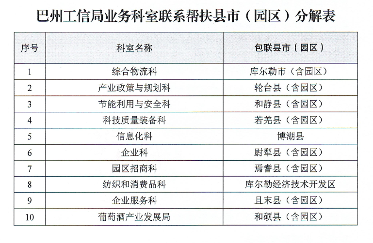 關于建立巴州工信局干部、科室聯系幫扶縣市(園區)工作機制的通知
