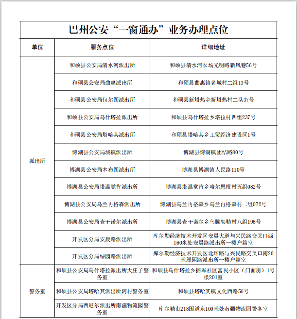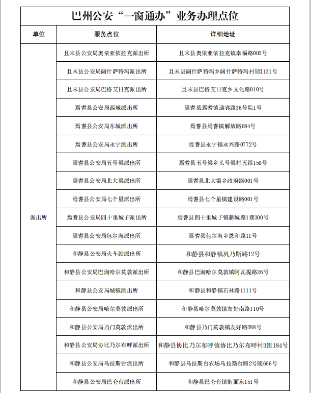 為深入貫徹落實自治區(qū)公安廳關(guān)于“一窗通辦”試點改革工作部署要求,積極回應(yīng)人民群眾對公安政務(wù)服務(wù)的新期待、新要求,巴州公安機(jī)關(guān)積極謀劃、主動探索,打破事項辦理限制、整合窗口通辦業(yè)務(wù)、升級優(yōu)化整體效能,打造“一個窗口、一次性辦理”的“一窗通辦”新模式,構(gòu)建“通窗為主、專窗為輔、有機(jī)統(tǒng)一”的綜合服務(wù)體。全州11個行政服務(wù)中心、58個派出所和3個警務(wù)室服務(wù)窗口升級為綜合服務(wù)窗口,其中11個行政服務(wù)中心綜合窗口受理通辦治安、交警、出入境88項業(yè)務(wù),58個派出所和3個警務(wù)室綜合窗口受理通辦治安、交警78項業(yè)務(wù),為辦事群眾提供更加高效便捷的公安政務(wù)服務(wù),請廣大人民群眾根據(jù)實際需求選擇服務(wù)點位辦理相關(guān)業(yè)務(wù)。