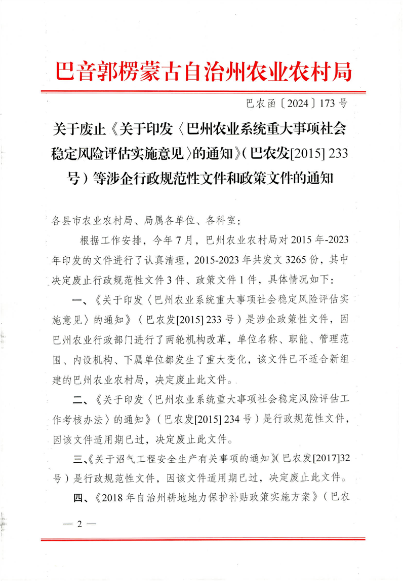 關于廢止《關于印發<巴州農業系統重大事項社會穩定風險評估實施意見>的通知》(巴農發﹝2015﹞233號)等涉企行政規范性文件和政策文件的通知