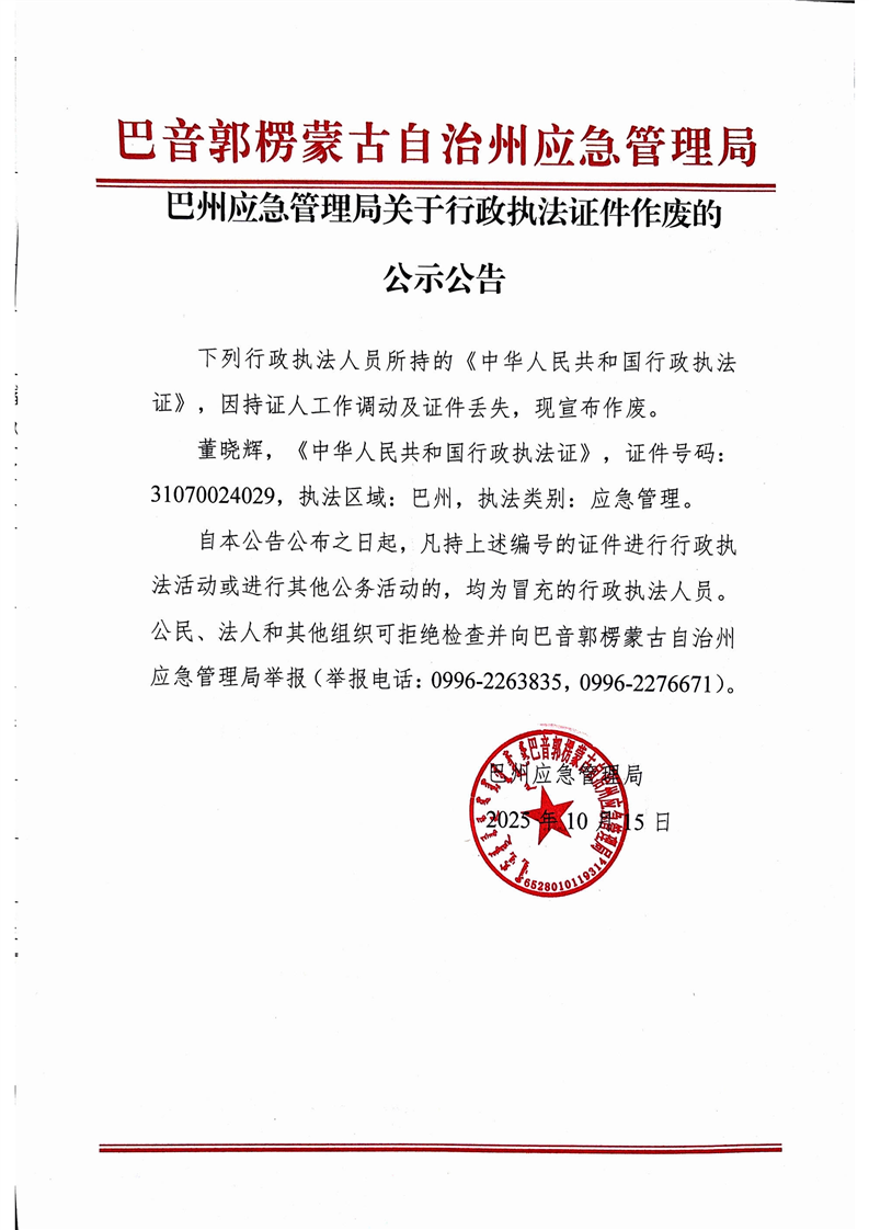 巴州應(yīng)急管理局關(guān)于行政執(zhí)法證件作廢的公示公告