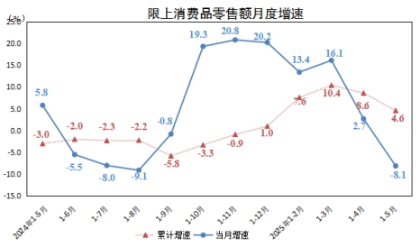 “以舊換新”政策拉動相關商品銷售較快增長。1-5月,家電類零售額同比增長49.4%;通訊器材類零售額同比增長34.7%。升級類綠色商品需求不斷釋放。智能手機類零售額同比增長31.8%;能效等級為1級和2級的商品類零售額同比增長52.7%;智能家用電器和音像器材類零售額同比增長46.6%。生活類商品消費穩中有升。糧油食品類零售額同比增長19.7%;日用品類零售額同比增長5.6%。