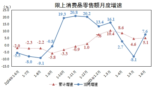 消費品“以舊換新”政策效應持續顯現。上半年限額以上單位家電類零售額同比增長84.6%;通訊器材類零售額同比增長31.7%。新能源汽車貢獻突出,6月當月限額以上單位汽車零售額增長5.3%,其中新能源汽車零售額增長34.6%。生活類商品快速增長。上半年限額以上單位糧油食品類、飲料類、日用品類零售額同比分別增長16.7%、6.2%、3.3%。