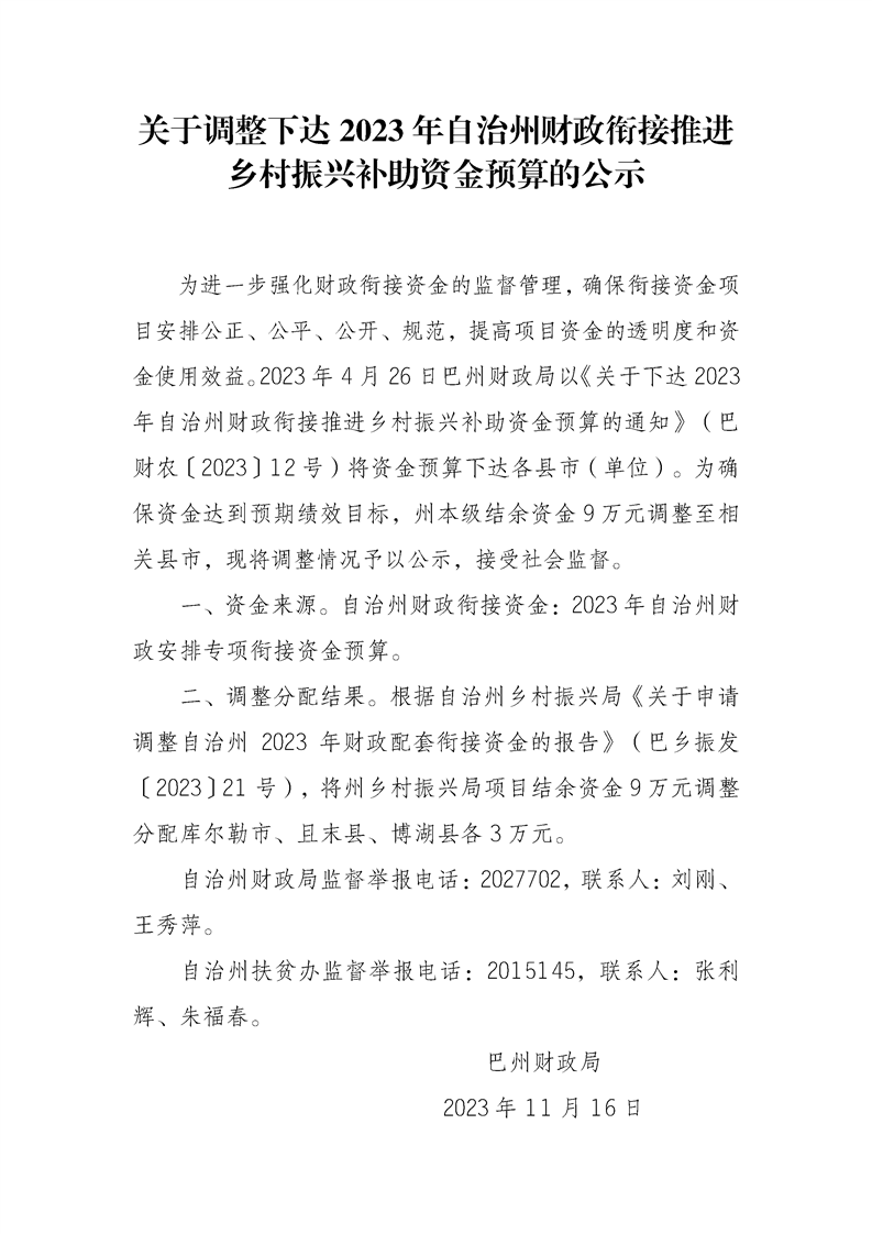 關(guān)于調(diào)整下達(dá)2023年自治州財(cái)政銜接推進(jìn)鄉(xiāng)村振興補(bǔ)助資金預(yù)算的公示