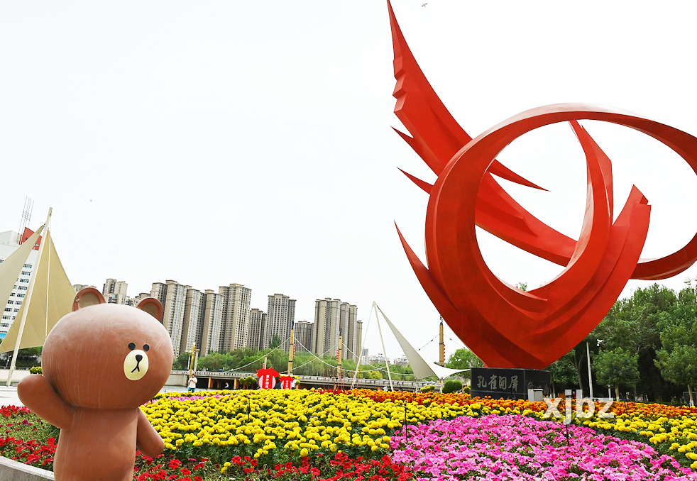 孔雀河清澈的河水潺潺而下,兩岸樹木青翠欲滴,各色園林小品與草地、樹木相映成趣,一派夏日好風光。(薛云少 攝)