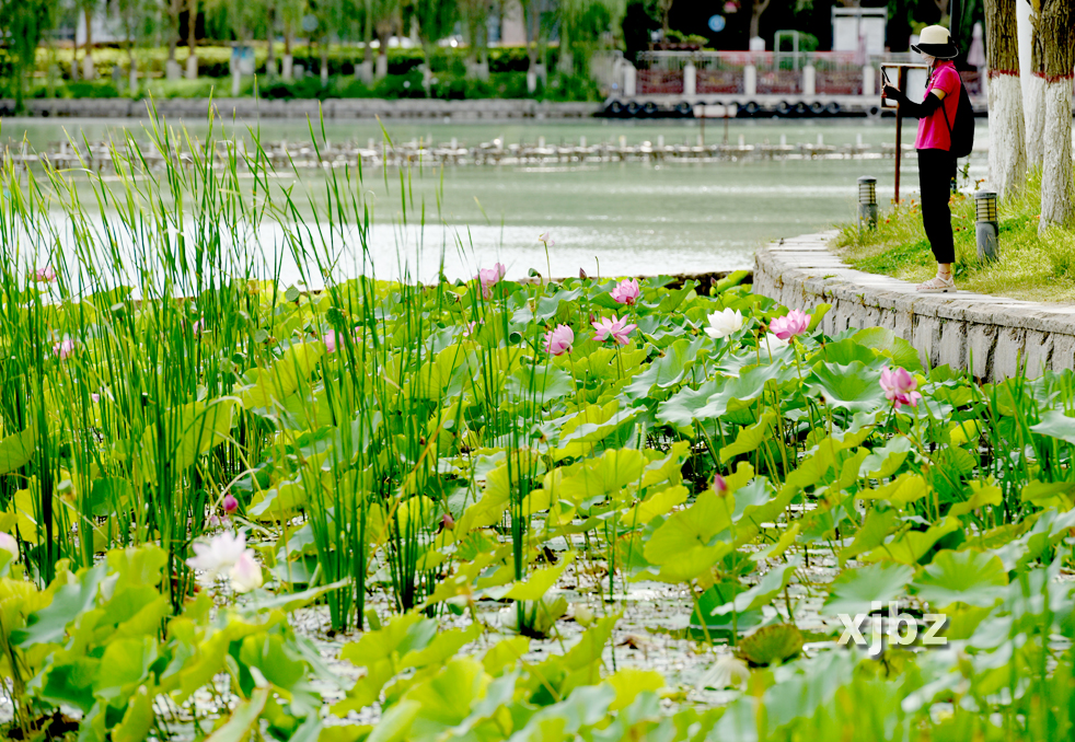 盛夏時節,庫爾勒市天鵝河荷花盛開,吸引市民前來拍照打卡。(陳劍飛 攝)