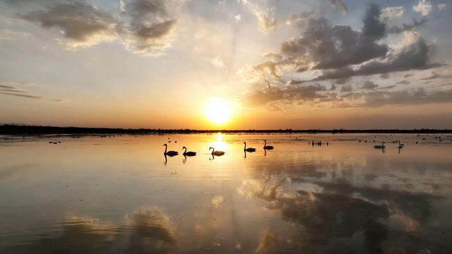 10月14日,遼闊的博斯騰湖波光粼粼,夕陽如金盤懸掛于天際,將天空與水面暈染成暖橙色調,成群結隊的天鵝在湖面游弋。