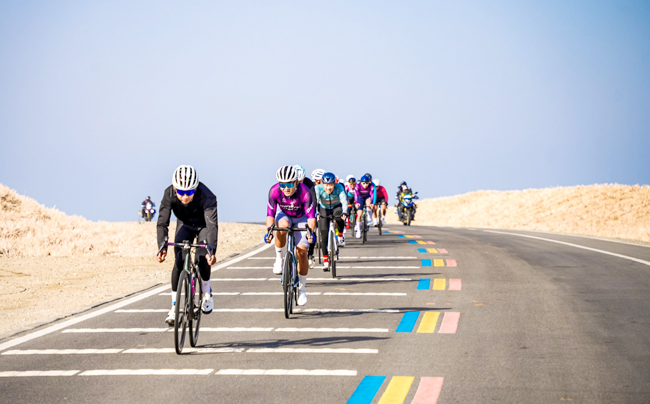 此次賽道設計充分體現“競技性與觀賞性并重”理念,包含平路、爬坡、下坡交替路況,串聯湖泊、沙漠、濕地等資源。選手們在“湖—沙—山”特色賽道上展開激烈競速,于騎行間盡覽博斯騰湖的旖旎風光。