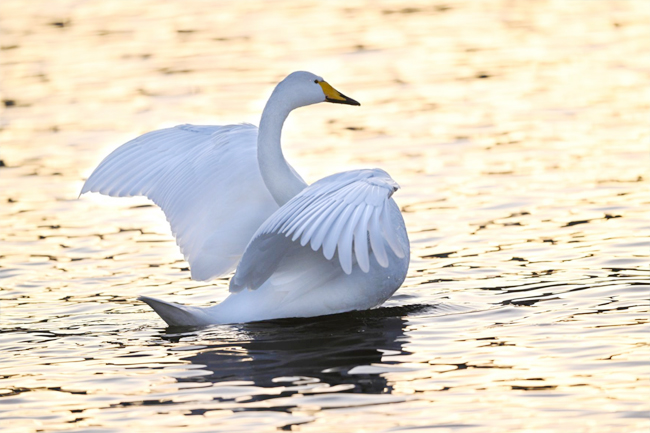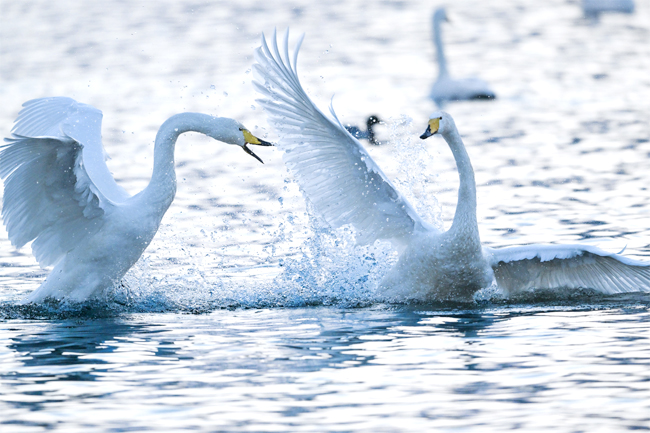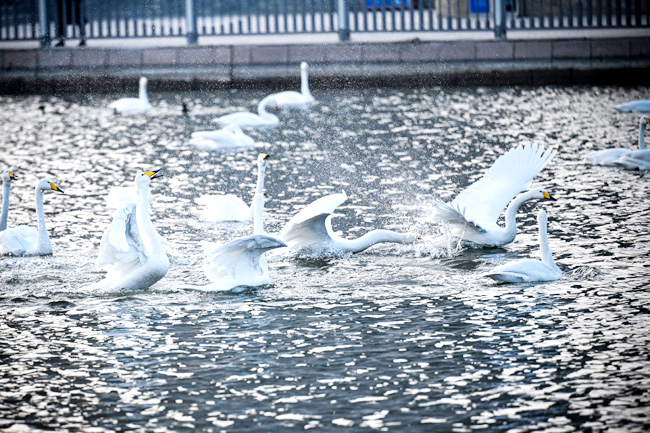 冬日的庫爾勒杜鵑河澄澈的水面上,潔白的天鵝或舒展雙翼,或追逐打鬧,濺起層層浪花。(圖片均由記者 陳飛 攝)
