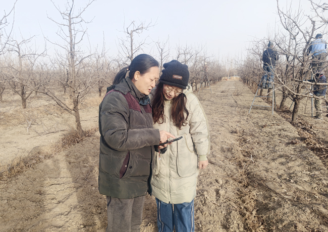 近日,科技特派員劉永杰(左)向香梨種植戶介紹氣象軟件。(記者 劉俊輝 攝)