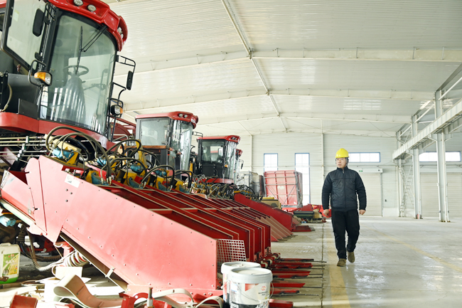 12月16日,庫爾勒源豐農機有限公司廠房,一名工人從新型辣椒收獲機旁走過。(記者 薛云少 攝)