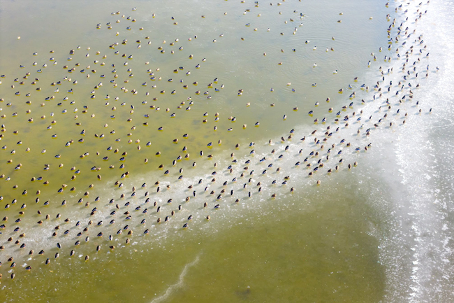 12月8日,上萬只綠頭鴨在博斯騰湖棲息覓食,景象十分壯觀。