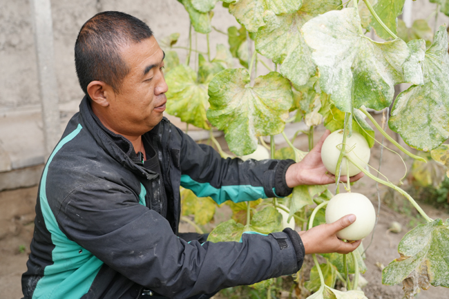 種植戶在大棚里采摘成熟的甜瓜。(通訊員 阿依佐合熱·阿尤甫 攝)