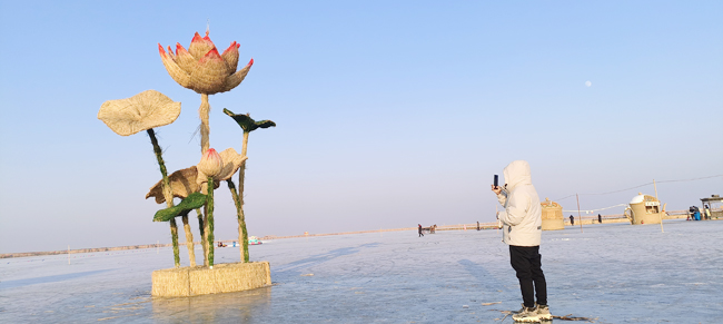除了經典的冰湖垂釣,冰上火鍋、馬拉爬犁、漂移冰車等十余項冰雪項目全面開放,讓游客玩得不亦樂乎。更令人眼前一亮的是,景區精心打造的巨型蘆葦藝術景觀小品遍布湖面,形態逼真的蓮花、蓮葉亭亭玉立,憨態可掬的小賣部卡通人物栩栩如生,成為游客爭相拍照打卡的網紅地標。