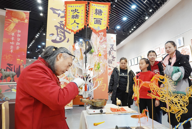 三樓空間則化身為一個全方位、沉浸式的“文化體驗場”。非遺展區內,刺繡的彩線在指尖流轉,剪紙的紅紙在手中綻放,那些曾被置于展柜的古老技藝,此刻正成為每個人都可以觸摸、可以創造的鮮活藝術形式。相鄰的春聯創作區墨香氤氳,書法名家與市民并肩揮毫,書寫新春祝福。在“書香潤年”閱讀體驗區,各類精選書籍靜候讀者;特別設置的沉浸式手工區成為親子互動的溫馨角落,家長與孩子們一起制作新春燈籠,創作特色“?!弊?,讓閱讀的靜謐與手工制作的樂趣相得益彰。