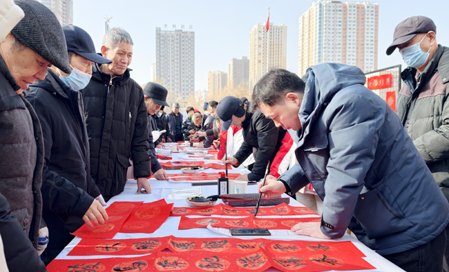 在寫(xiě)春聯(lián)送祝福活動(dòng)區(qū),巴州書(shū)法家協(xié)會(huì)書(shū)法家及書(shū)法愛(ài)好者揮毫潑墨,為群眾現(xiàn)場(chǎng)書(shū)寫(xiě)春聯(lián)與“福”字。一副副飽含祝福的春聯(lián),不僅傳遞新春?jiǎn)柡颍休d著對(duì)祖國(guó)繁榮昌盛的美好祝愿。