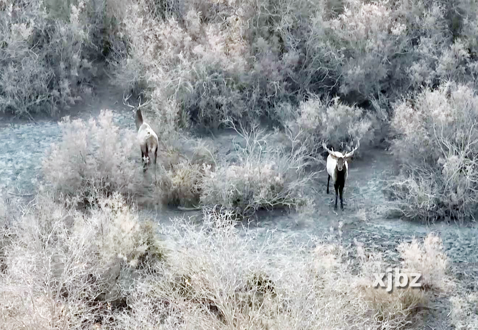 這是11月24日輪臺縣林業和草原局工作人員在塔里木胡楊林公園巡護途中用無人機拍攝到的塔里木馬鹿。