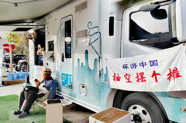 張建成在房車前拍打皮鼓。(記者 陳彥強 攝)