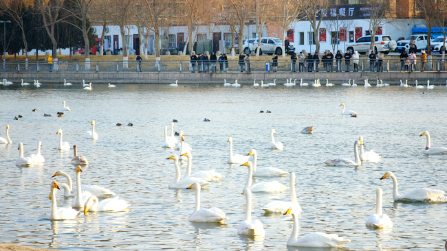 1月1日,市民在庫爾勒市杜鵑河畔觀賞天鵝。元旦當天,杜鵑河畔熱鬧非凡,大批市民與游客來此打卡、游玩。(記者 薛兵 攝)