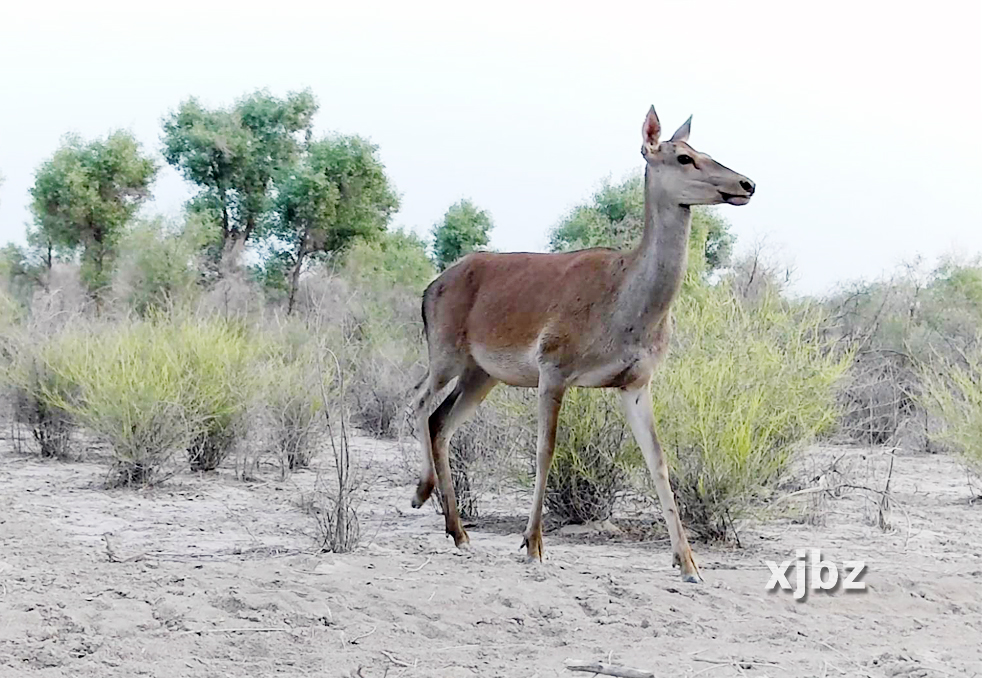 身披棕黃皮毛的塔里木馬鹿好奇而警惕地打量著四周。(新疆塔里木河胡楊林生態(tài)系統(tǒng)國家定位觀測研究站紅外相機(jī)拍攝)