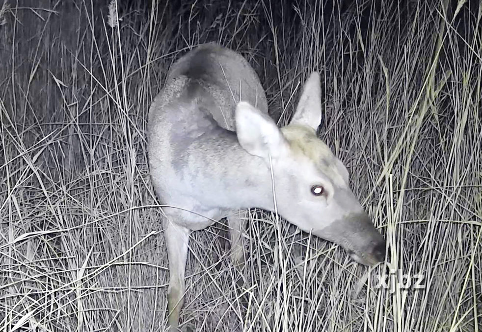 一只塔里木馬鹿好奇地湊近紅外相機鏡頭。(圖片由新疆塔里木河胡楊林生態系統國家定位觀測研究站提供)